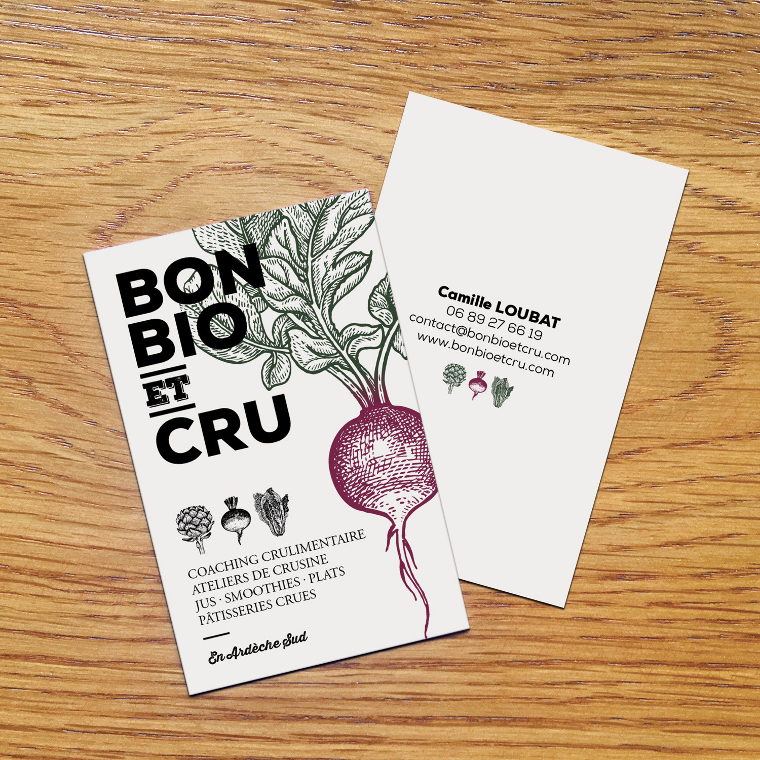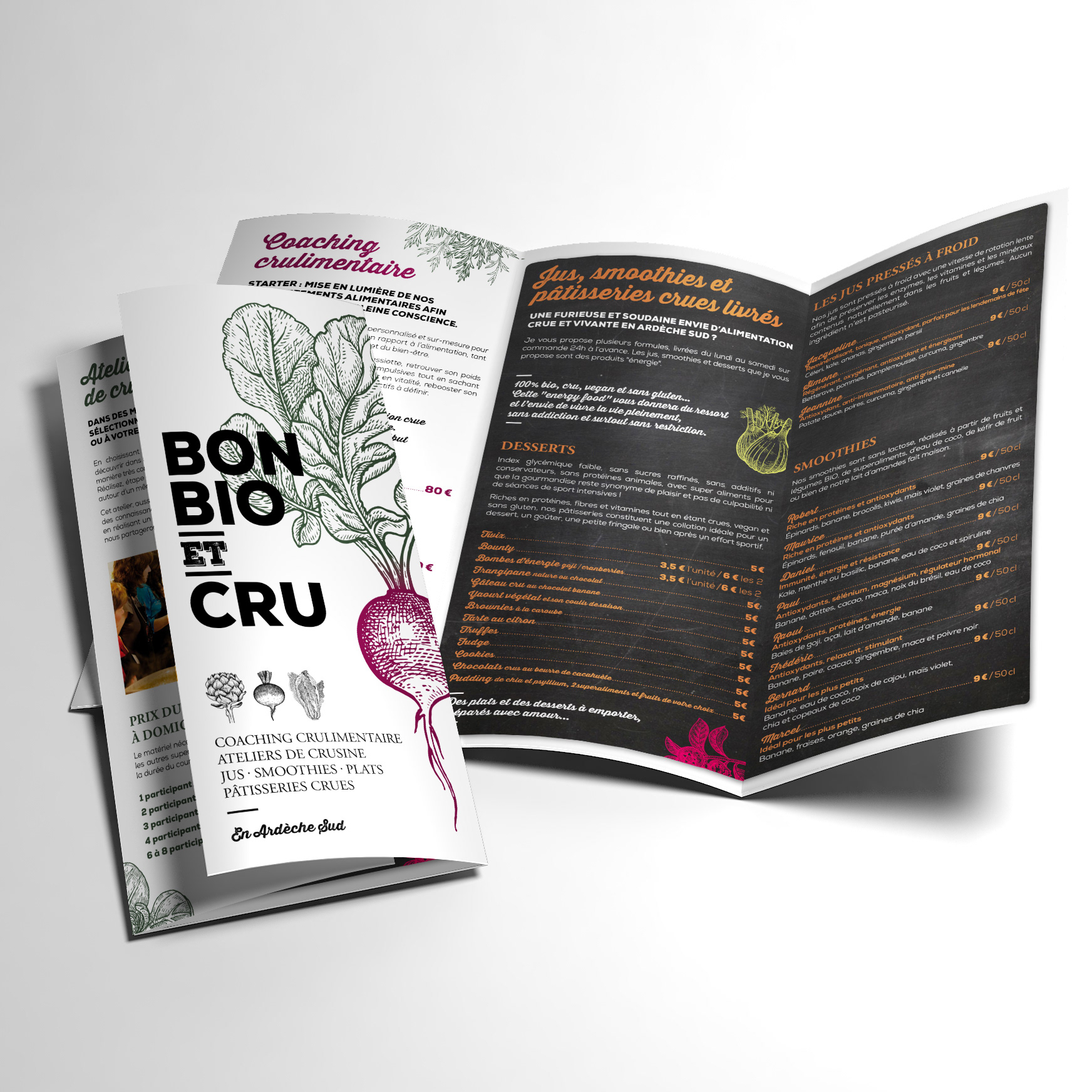 Coaching alimentaire, ateliers de cuisine et préparation de plats crus. Création de l'identité visuelle : logo, cartes de visite, dépliant…