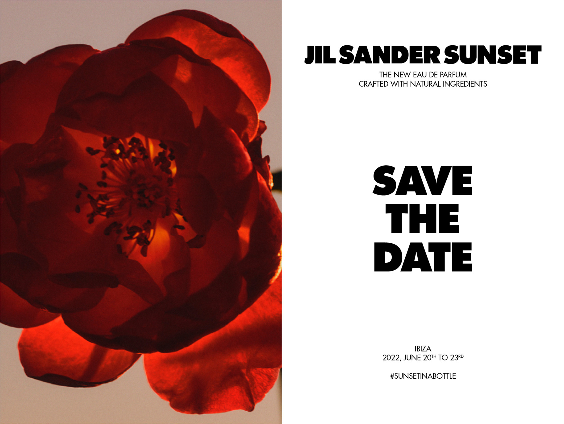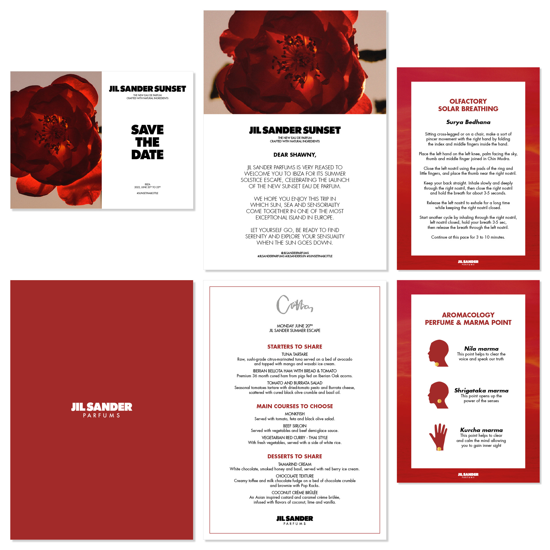 Création et design graphique pour le voyage de presse du nouveau parfum Sunset de Jil Sander : save the date digital, welcome letter, menus et fiches atelier sensoriel. Réalisations sur commande et en collaboration avec l'agence A.D.R.