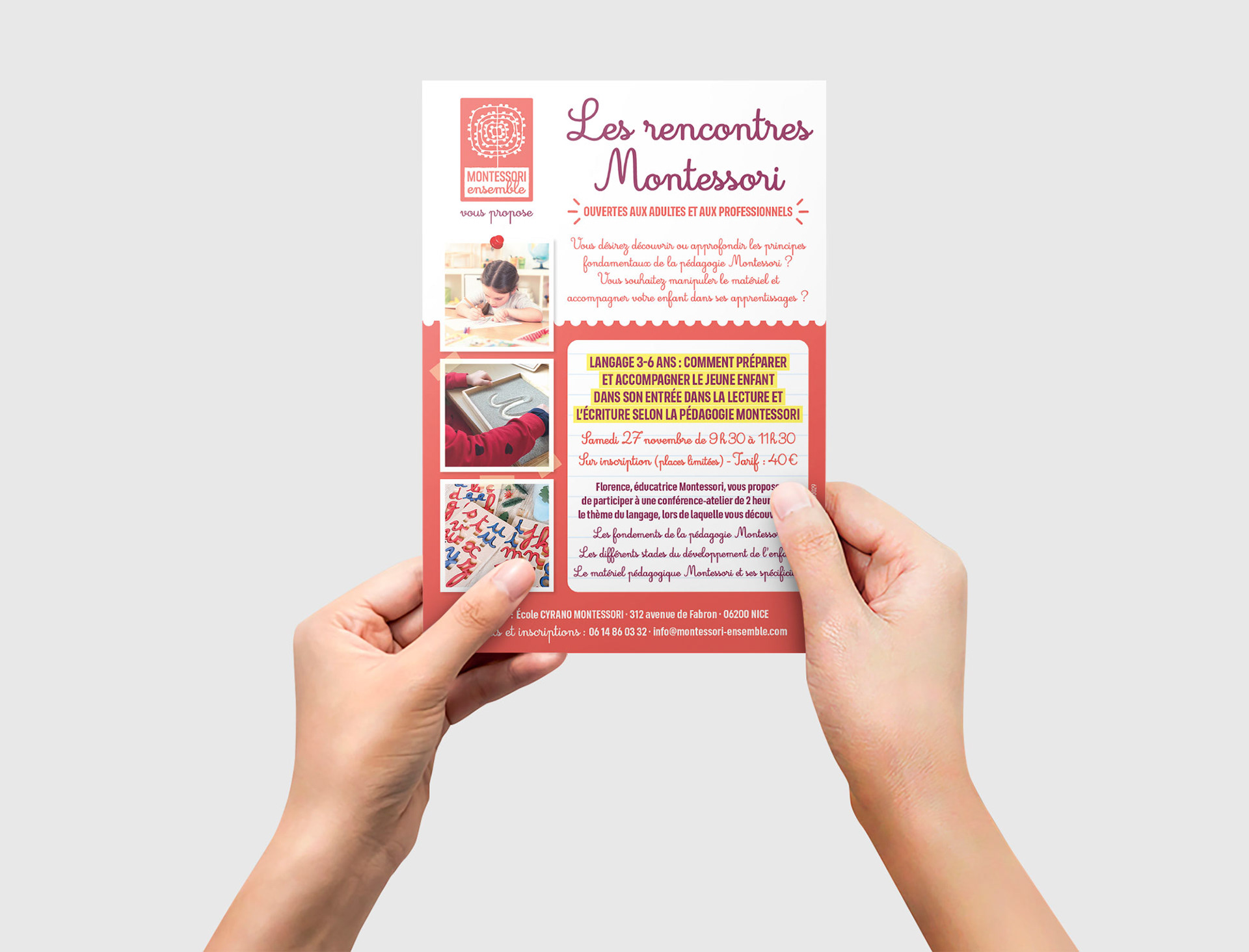 Ateliers, conférences et formations autour de la pédagogie Montessori des 0-3 ans et des 3-6 ans. Création de l'identité visuelle : logo, cartes de visite, affiche, dépliant et communication digitale.