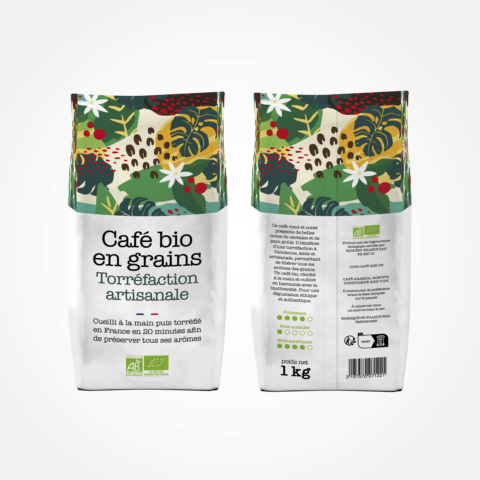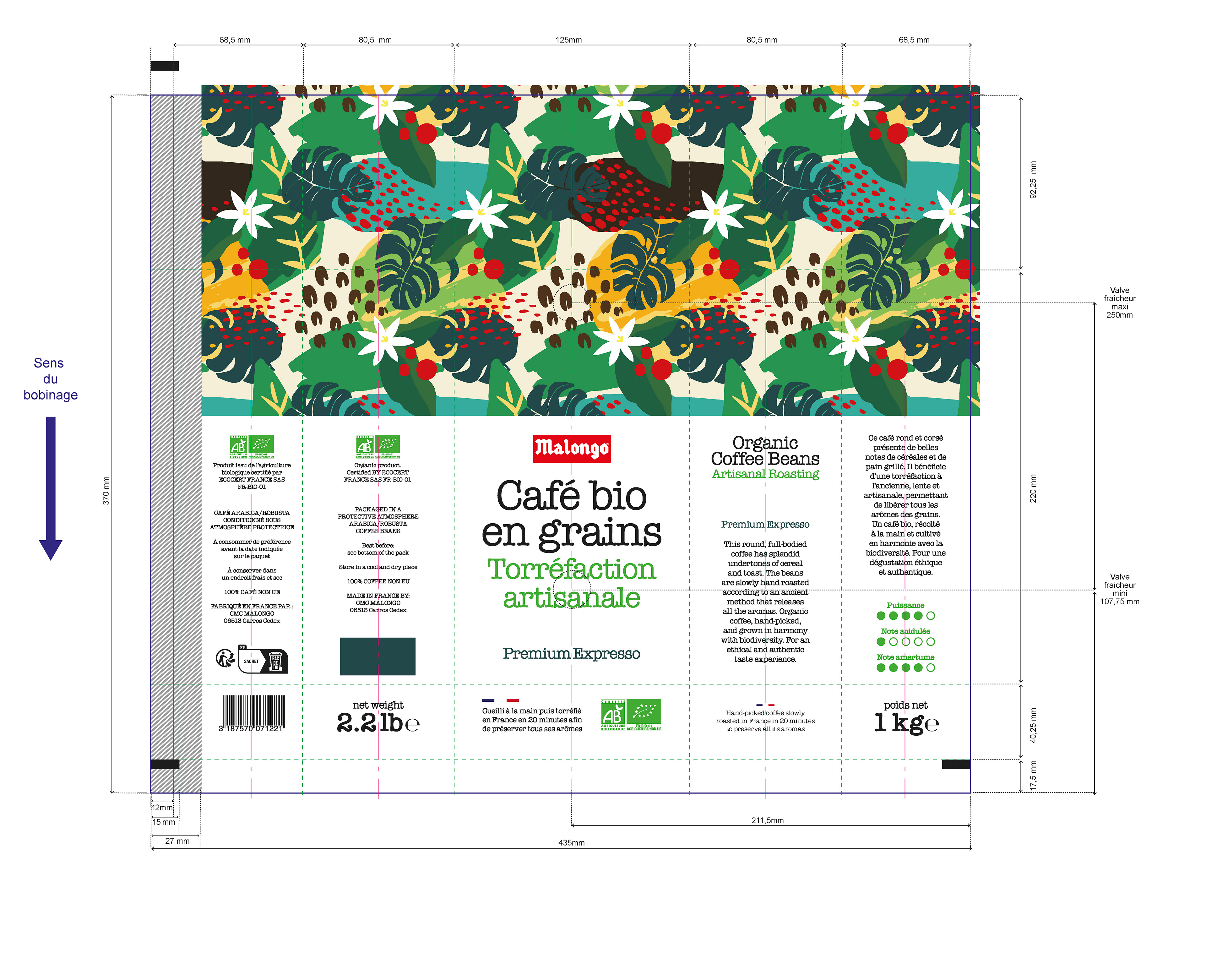 Création du pack 1 kg de Café bio en grains MALONGO pour la grande distribution (Carrefour, Hourra, etc…)